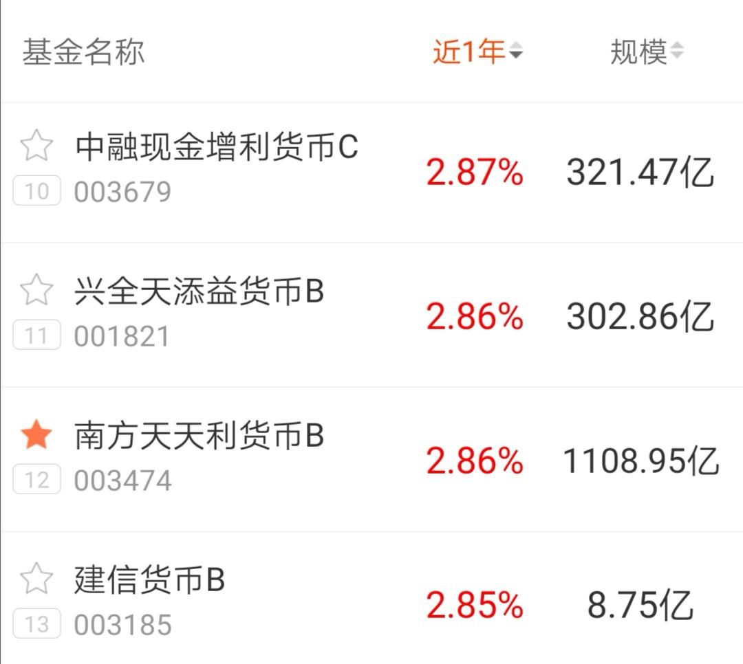 通过筛选,南方天天利货币B(003474)比较优秀。近一年的收益率2.86%,排名12。基金规模1108.95亿,排名第四。