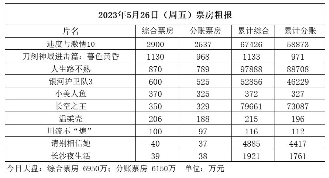 5月26日(周五),全国共排映4.1万场,观影人次约183.6万,根据初步统计产出票房6950万。