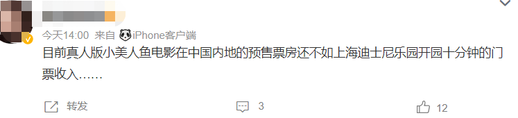 甚至还有网友调侃表示:《小美人鱼》在中国内地的预售票房,还不如上海迪士尼开园十分钟的门票收入。