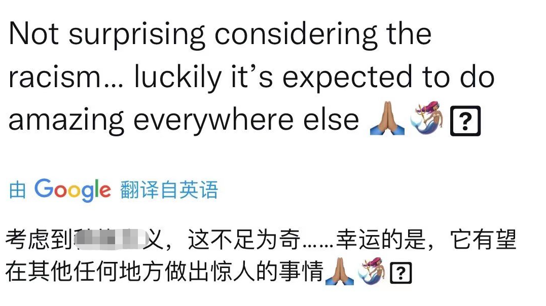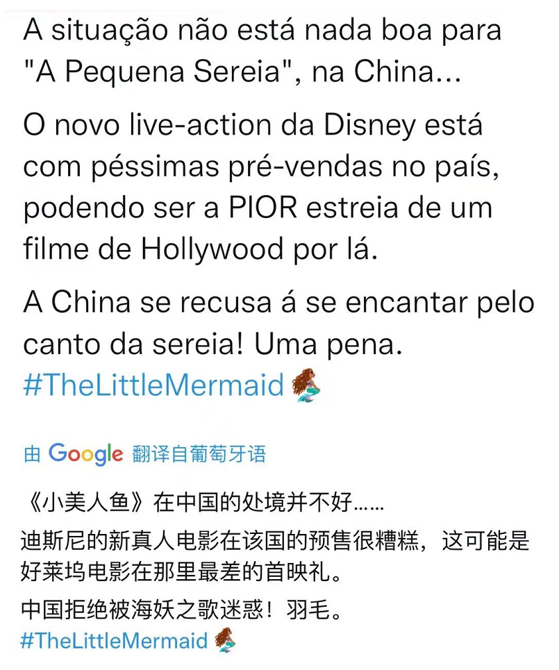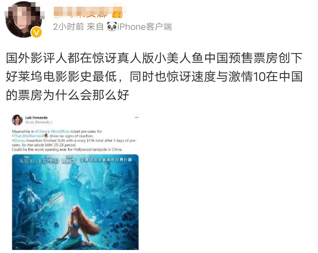 而如此惨淡的票房趋势,也引来了一些国外网友的质疑和好奇,有网友表示自己出于好奇,查看了《黑豹1》等影片在中国的票房情况,发现都是百万以上,跟《小美人鱼》形成鲜明对比,他认为这是一个多么奇怪的现象,甚至还有国外网友把票房成绩不佳归咎于内地观众上。