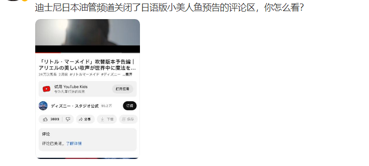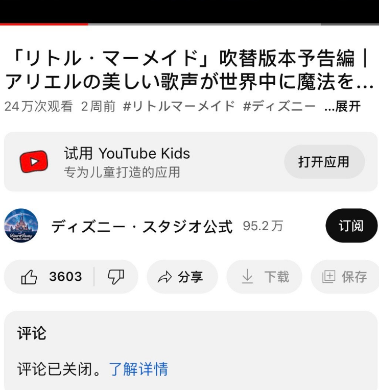 而且目前来看,观众对《小美人鱼》是有审美共识的,并不是只有中国内地观众对这部电影不感冒,迪士尼日本油管频道疑似不堪负面攻击,关闭了日语版《小美人鱼》的预告评论区。