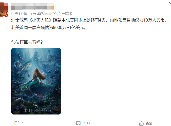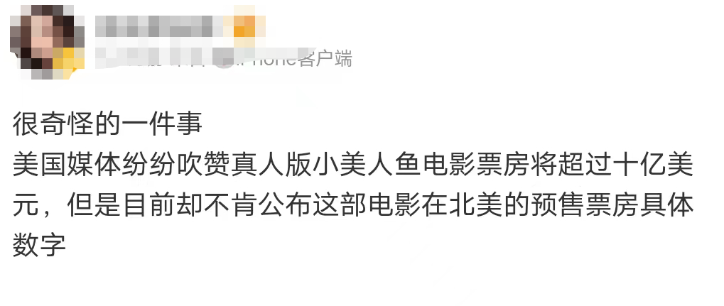 看到国外网友这些猎奇之声,可能有观众会觉得疑惑,《小美人鱼》在外网的预售成绩又如何呢?北美媒体对《小美人鱼》预期票房很乐观,有望以1.1亿美元票房开画,符合迪士尼一贯水准。