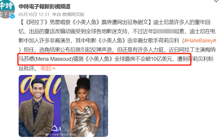 就连迪士尼真人电影《阿拉丁》的男主角Mena Massoud,也对《小美人鱼》电影的票房提出了质疑,还遭遇了批评。