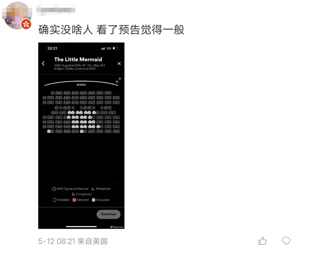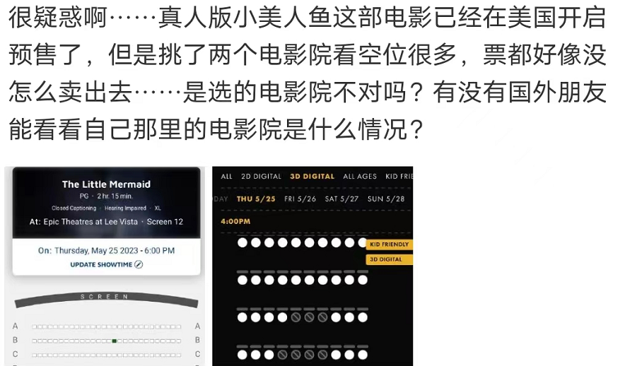 但是,在北美媒体鼓吹《小美人鱼》预估票房的同时,并没有给出精确的预售票房数据,只给出了预测票房,部分身在北美的中国网友则晒出附近电影院图片表示,体感《小美人鱼》的预售票房并不是很好,还有多个空置座位没有售出。