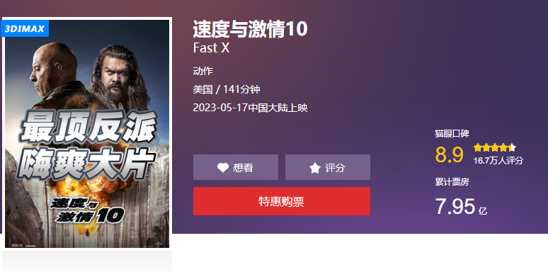 但2023年《速激10》,全球市场5.43亿美元,在中国市场只有1.1亿美元(约8亿人民币),相比于超过2亿美元的制作成本,注定赔了大本。