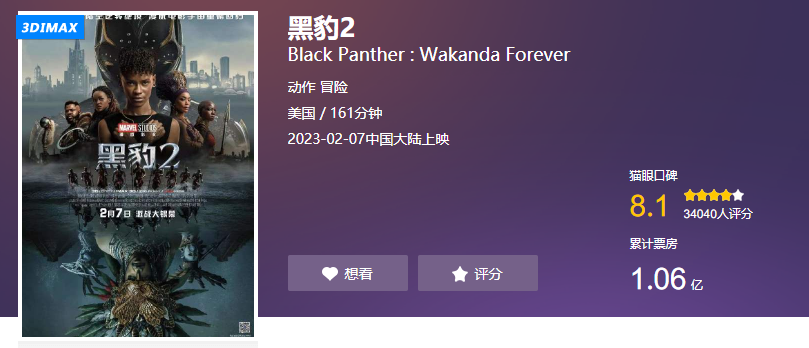 2023年,全球票房达到8.6亿美元票房的《黑豹2》,在我国票房只有1500万美元(约1亿人民币),在北美/英国/墨西哥/法国/巴西/澳大利亚/德国/韩国之后,仅列第九票仓。