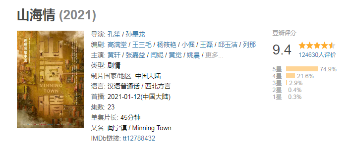 2021开年第一高分剧集被主旋律题材扶贫剧《山海情》拿下,豆瓣评分达到9.4,是近年来电视剧少有的高分。