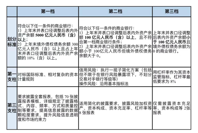 ,按照银行间的业务规模和风险差异,划分为三个档次银行,匹配不同的资本监管方案。对于国际活跃银行严格对标国际标准;对中小银行,则在确保资本监管审慎性的前提下,进一步简化计量规则,减少合规成本。