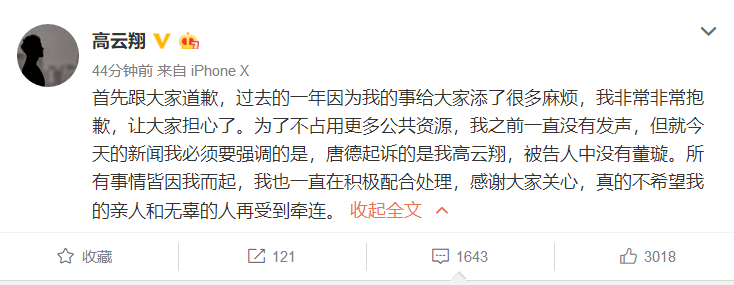 2019年7月,高云翔和董璇完成离婚诉讼,据媒体称主要为保全女方财产。此前4月高云翔还特地发微博澄清,“唐德起诉的是我高云翔,被告人中没有董璇”。这对8年的娱乐圈“模范夫妻”分手,高云翔凭《芈月传》义渠王角色积累的人气也烟消云散。