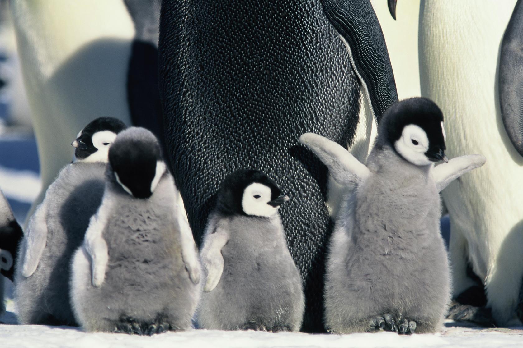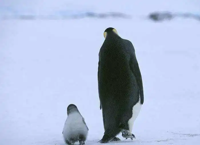 雄企鹅用自己的身体温暖着它,细心地照顾,无微不至地保护,哪怕是最后的一点点食物也要留给幼崽。