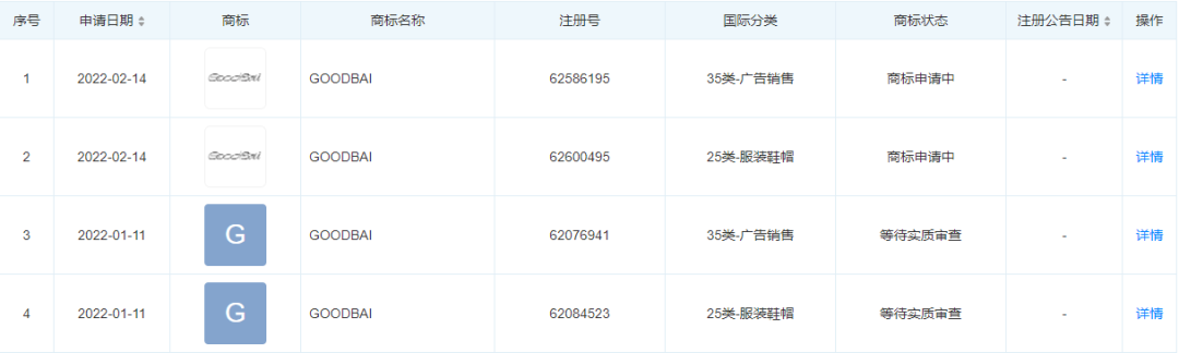 ▲喆亭好申请的“GOODBAI”商标 图片来源:天眼查