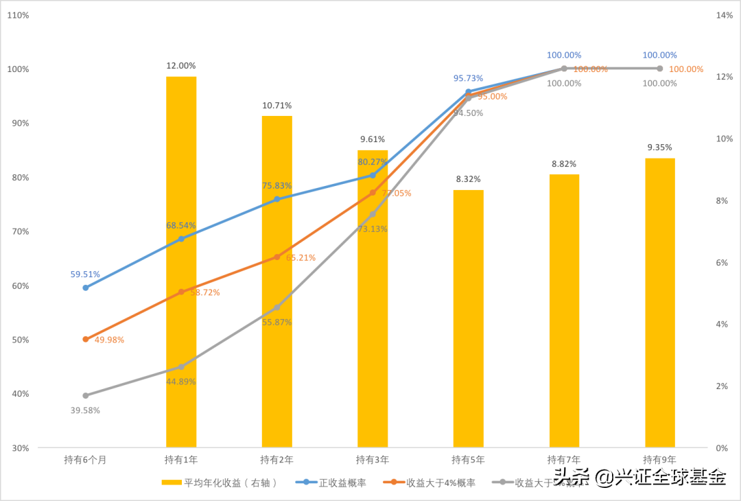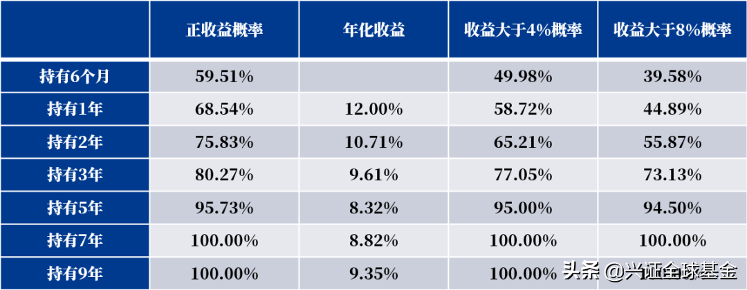 如下图表,以中证偏股基金指数为例进行测算,持有时间从6个月到1年、2年、3年……9年,可以看到正收益、收益大于4%、收益大于8%的概率均不断提升。