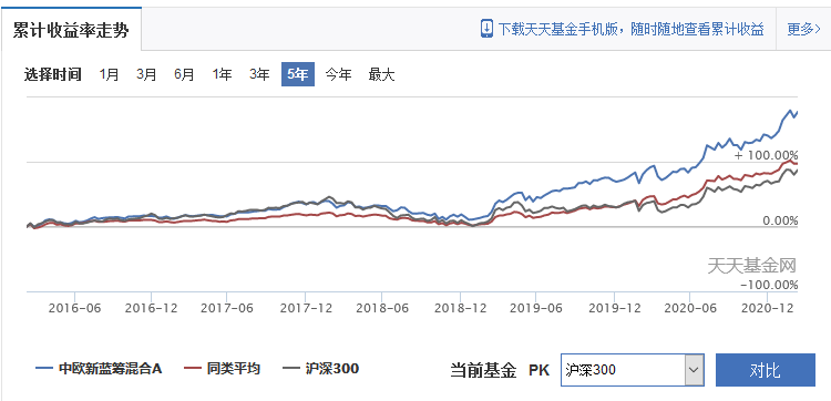 从近五年的收益上看,中欧新蓝筹混合的业绩并不是多么的优秀,约为170%,单从这方面来说,还没有去年的基金之王一年的收益高!但如果将收益走势按照10年、5年、3年和1年来看,基金差的时候并不输沪深300指数,好的时候又能跑赢市场平均收益,更重要的是这部分收益还能保得住,短期没什么爆发力,但长期稳步向前。其实这样的风格很适合基民长期投资并持有。