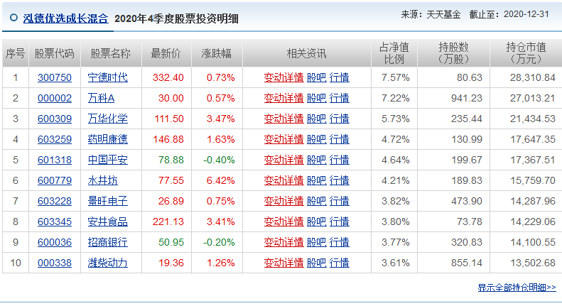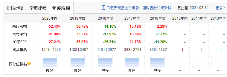 查看基金2020年四季度的持仓,可以发现基金也是持有了部分的核心资产,当然,这部分核心资产的比例相较于那些爆款基金来说似乎占比没有那么大。这也就导致了基金业绩增速并不是很突出,2020年大概有55%,2019年只有37%。但是2021年的回撤也没有那么大,从年初至今,收益还是正数。