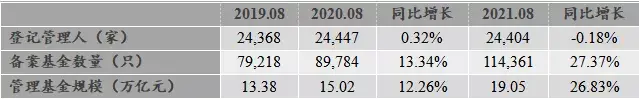 截至2021年8月,登记管理人数量较上一年同比出现小幅度下降,同比减少0.18%;备案基金数量和备案基金规模的增长率相比较2020年同期大幅提高,备案基金数量增长率由2020年8月末的13.34%上升至2021年8月末的27.37%,备案基金规模增长率由2020年8月末的12.26%上升至2021年8月末的26.83%。