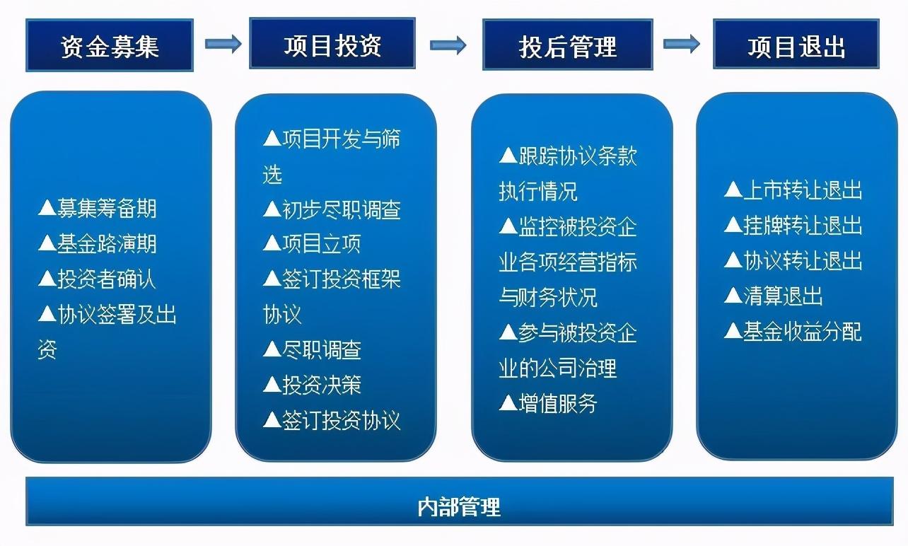 私募股权基金的运作流程是其实现资本增值的全过程。从资本流动的角度出发,资本首先从投资者流向股权投资基金,经过基金管理人的运作再流入被投资企业。在投资之后的阶段,基金管理人通常会以各种方式参与被投资单位的管理,待企业经过一定时期的发展之后,选择合适的时期再从被投资企业退出,进行下一轮资本流动循环。由此,与资本流动相对应的股权投资基金生命周期的四个阶段就是资金募集、项目投资、投后管理和项目退出,基金内部管理贯穿始终。