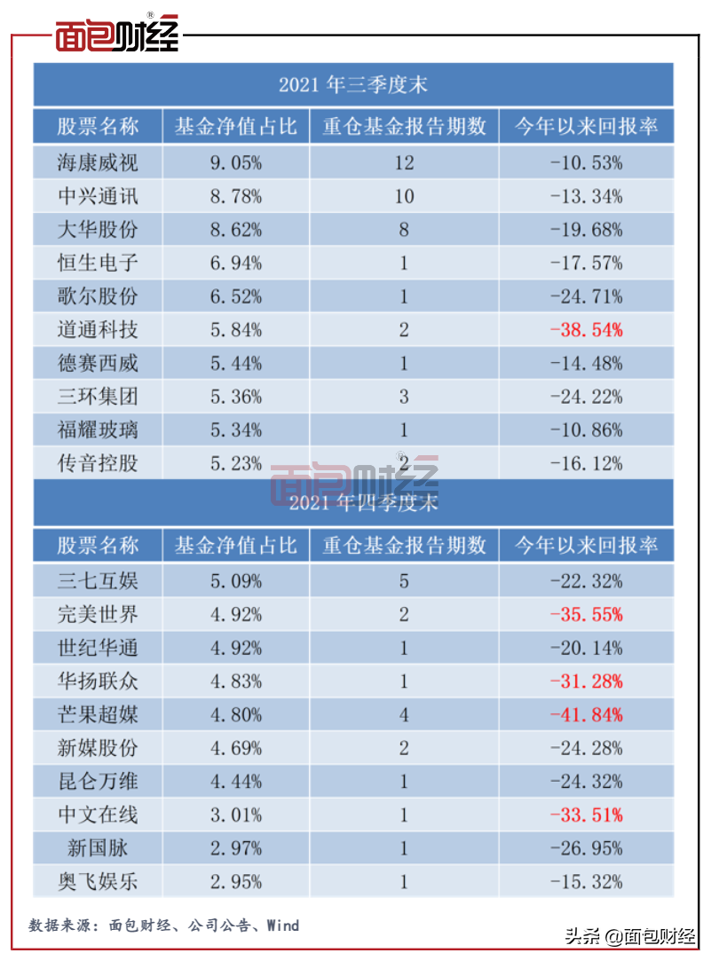 受大环境影响,2021年三、四季度重仓股今年以来收益率都不太理想。尤其是四季度,重仓股中跌幅超过30%的股票有4只,明显多于三季度,其中芒果超媒回撤更是超过40%。