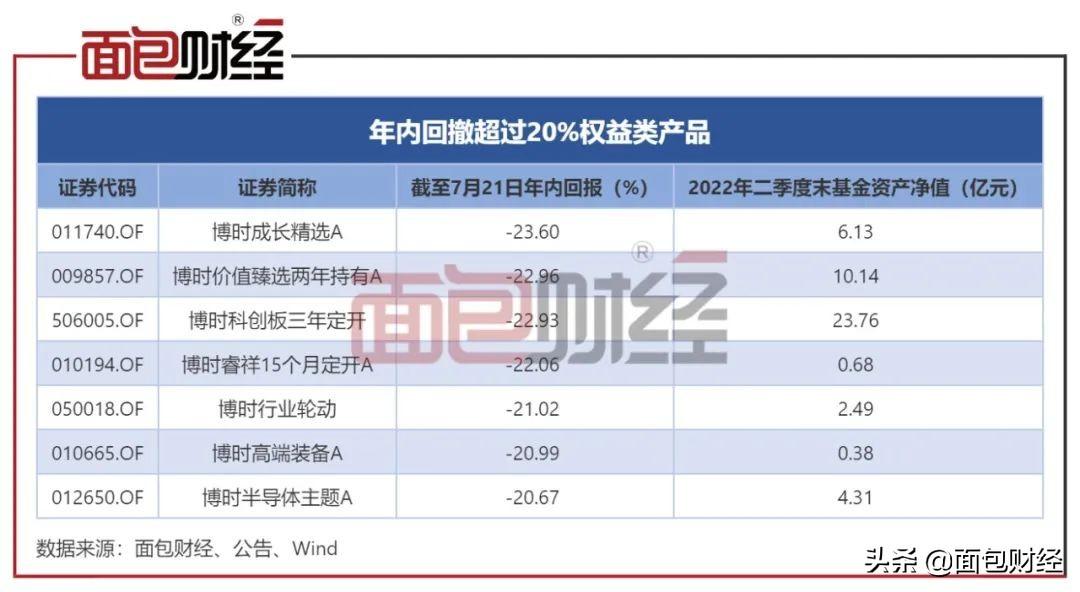 截至2022年7月21日,博时基金偏股型产品年内回撤在偏股型产品管理规模超过1000亿元的基金公司中排名相对靠前。数据显示,截至7月21日,博时基金旗下权益类产品(包括普通股票型、偏股混合型、灵活配置型以及平衡混合型基金,均为初始基金口径)年内平均回撤约10.72%,共有7只基金回撤超过两成。
