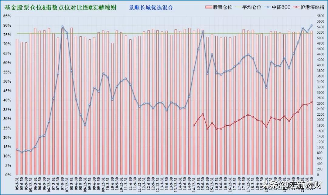 注:上图为沪港深综指启用以来该基金仓位(柱线)与指数(折线)对比,期间调仓平均幅度