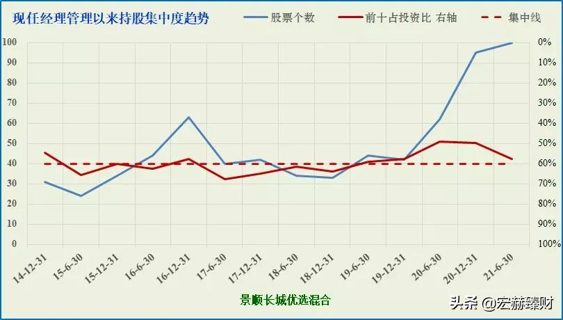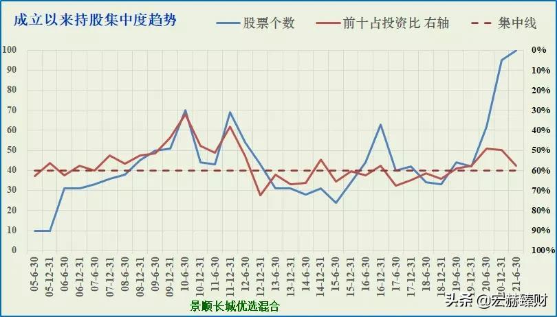 红色线为前十占比;蓝色线为股票个数;虚线为良好参考线