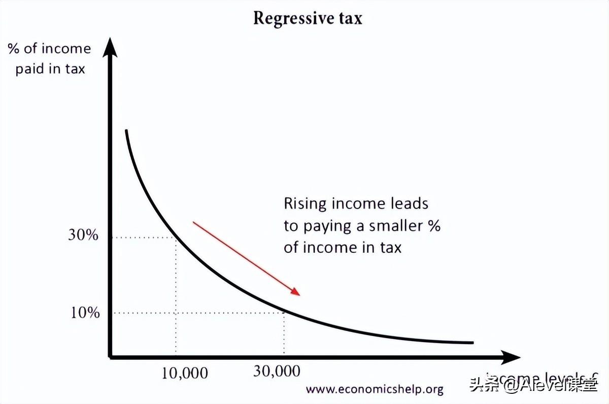 This occurs when an increase in income leads to a smaller % of their income going on the tax. E.G excise duties, tobacco duty. A regressive tax means those on low incomes pay a higher percentage of their income in tax. 当收入的增加导致他们的收入中用于纳税的比例降低时,就会出现这种情况。例如,消费税、烟草税。累退税意味着低收入者支付的税收占其收入的比例更高。