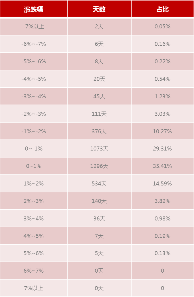 下跌方面,跌幅在2%至3%的天数有83天,占比3.41%;跌幅在3%至4%的天数有38天,占比1.56%;跌幅在4%至5%的天数有13天,占比0.53%;跌幅在5%至6%的天数有13天,占比0.53%;跌幅在6%至7%的天数有8天,占比0.33%;跌幅在7%以上的天数有6天,占比0.25%。