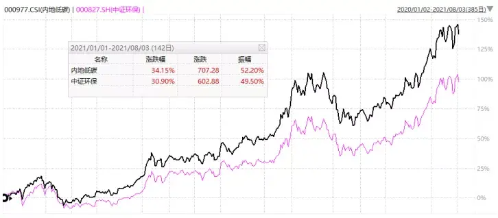 区别在于内地低碳指数权重股的集中度稍高一些,为67.49%,中证环保指数为55.19%。所以,在去年底,碳中和启动后,内地低碳指数比中证环保指数表现更优。今年以来,内地低碳指数涨幅达到34.15%,中证环保指数为30.90%。