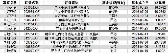 目前跟踪中证环保和内地低碳指数的基金一共有11只,其中广发中证环保产业及其联接基金、华夏中证内地低碳经济主题的规模最大。