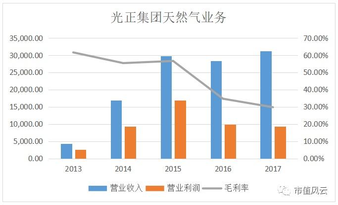 从下图中可以看到,天然气业务尽管前几年营收和营业利润持续上升,但2015年后,营收微增,净利润却大幅下滑。毛利率更是一路下跌,2013年还有61.63%,到了2017年,低的只有29.81%。