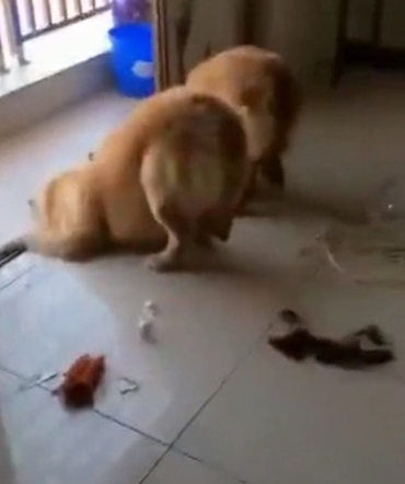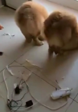 主人才出去一会儿,再回到家时,眼前的一幕愤怒不已,无语到底,简直想把两条狗子给抽死。地上全是咬断了的电线,从客厅到卫生间,拇指粗的电线被咬得稀巴烂,主人嘴里一边骂着,手里一边拿着一只木铲子,走到两只狗子面前,而两只狗子,一只是金毛,一只是小短腿儿的柯基早已乖乖趴在一旁,主动认罪。