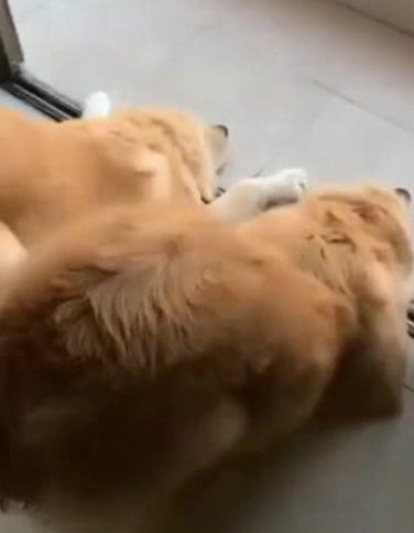 金毛这么高智商的狗狗,竟然干起了这等没有智商的事情,肯定是柯基教的,没有尾巴的胖柯基屁股拱起来的样子简直不要太可爱,感觉主人都下不了手了。两个一动不动地趴在地上,两只手放在前面,就像“投降”的姿势一样,大概是在对主人说“主人,我们错了,我们下次再也不敢了”。