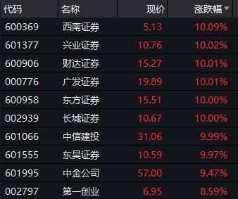 券商股翩翩起舞,板块掀涨停潮。截至收盘,西南证券、兴业证券、财达证券、广发证券等8股涨停。中金公司涨超9%,第一创业、华泰证券、浙商证券涨超8%。