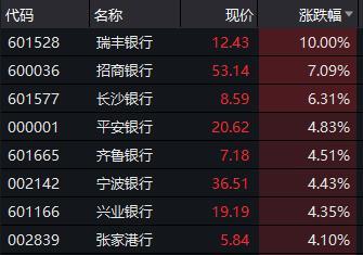 同属“金融三剑客”的银行、保险板块也不甘示弱,截至收盘,瑞丰银行涨停,招商银行涨超7%,长沙银行涨超6%。