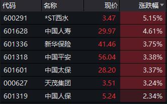 *ST西水涨停,新华保险、中国平安、中国太保等涨超3%,中国人保涨超2%。