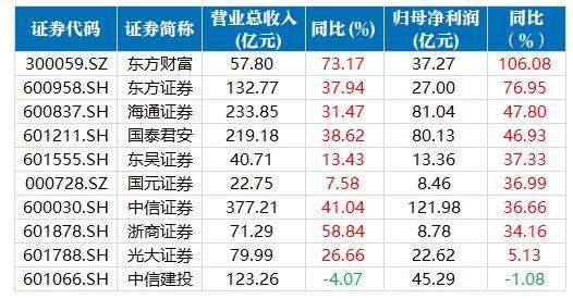 券商股中报业绩表现良好。截至今日,已有10家券商披露了中报成绩单,其中,东方财富、东方证券上半年净利润分别同比增长106%及77%。仅有中信建投一家券商录得营收、净利润同比下滑。