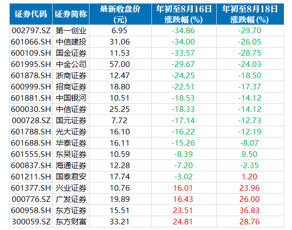 而券商股经过近两日的反弹,第一创业、中信建投、国金证券的跌幅均收窄至30%以内。