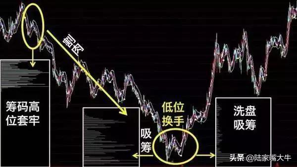 我们以一轮牛市开始到熊市结束的完整行情来描述,这样大家就会更容易理解。股价长期在底部运行,主力收集筹码建仓动作完成。(单峰针形筹码)——主力开始抬拉股价,股价脱离原来的筹码密集区(开始形成双峰筹码,筹码发散。)——在某一价位整盘(也可以称为震荡、洗盘或震仓。)(双峰筹码正式形成)——上述抬拉整盘的动作在股价的拉升过程中反复多次(形成多峰筹码,就是筹码再发散。)——主力开始派发(底部筹码比例开始减少)——主力派发完成(底部筹码迅速消失,形成单峰三角形筹码。)——由于没有统一的资金维持和抬拉股价,股票开始逐步下跌,而且下跌反弹的变化会反复多次。(自上而下的多峰筹码)——经过很长一段横盘时间的运行,大部分套牢筹码认赔出局。(底部筹码再聚集)