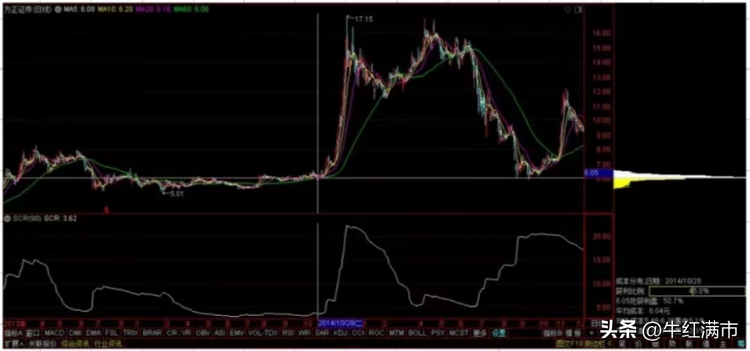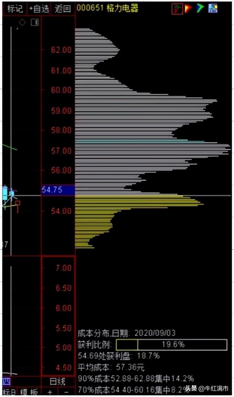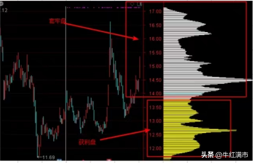 同时,以当日收盘价为基准,收盘价以上代表获利盘,用白色表示,收盘价以下为套牢盘,用黄色表示。同时还会有个筹码平均价格。并且最随着,不断地买卖,底部和顶部筹码会不断切换,底部筹码变少,顶部筹码增加。