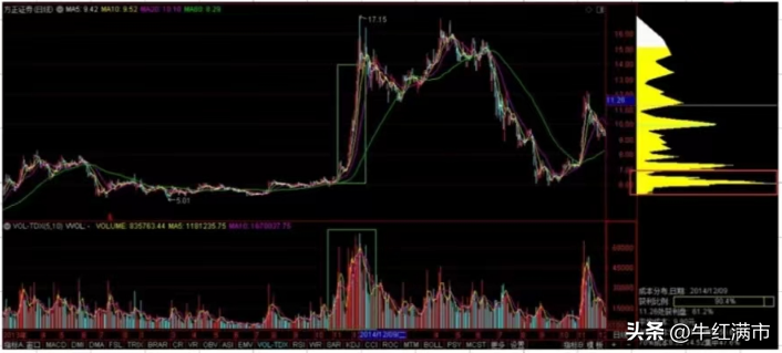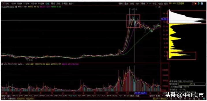所以,在股价不断创新高的拉升过程中,其成交量不断放大。从筹码分布图中我们可以看出,主力底部筹码不断变少顶部筹码逐渐增加。