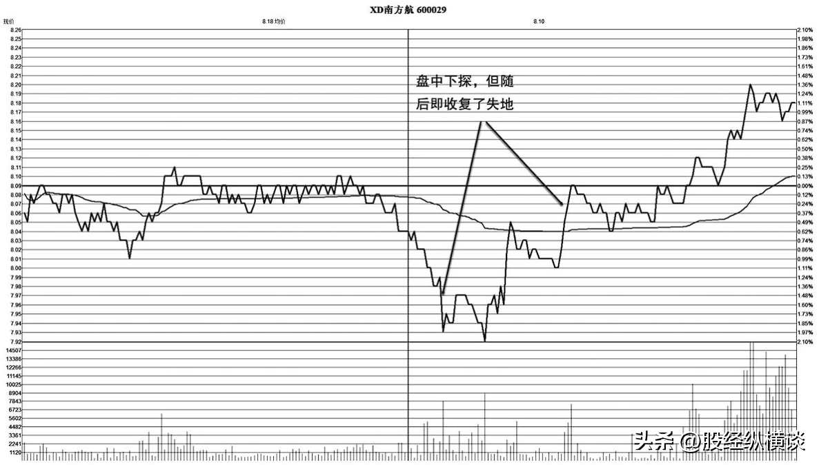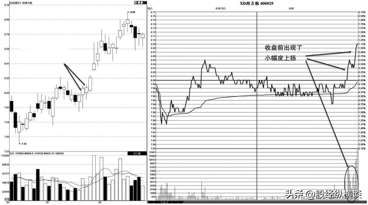 图2-1所示为南方航空分时图,个股在震荡盘升中,出现了短线回调,当日的盘中运行平稳,收盘前则是相对独立的小幅度上扬,收盘前的异动可能是个股短线上涨的信号,但应结合次日走势来分析。