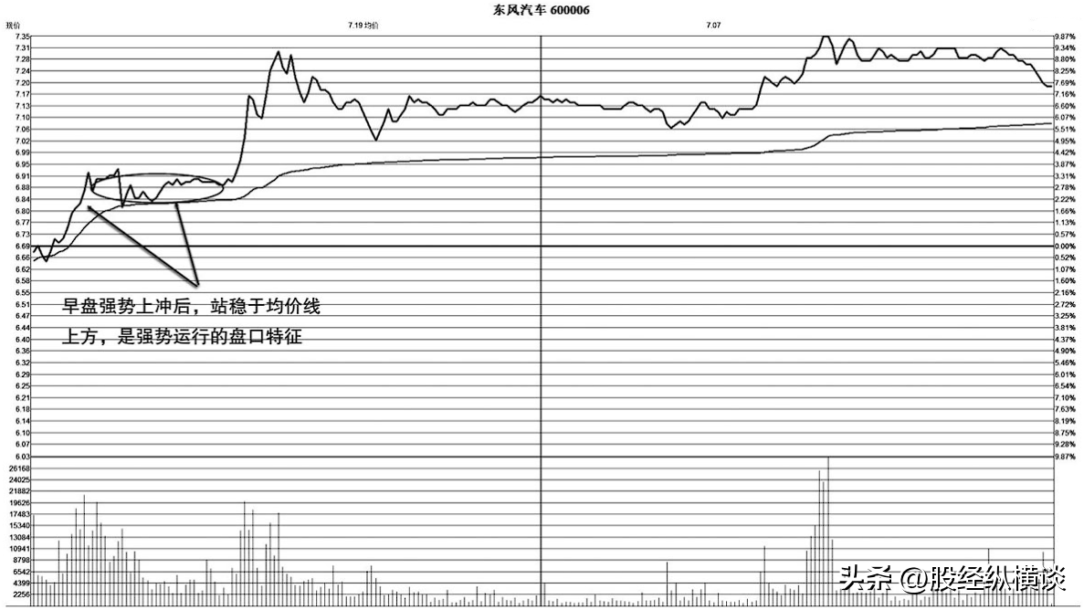 图1-1所示为东风汽车分时图,个股在午盘之后出现了两波强势上扬,上扬过程中可以看到分时量的放大支撑,这是买盘积极入场推动的信号,在上扬后,分时线始终与均价线保持一定距离,这是多方占据明显主动、空方抛压较轻的标志。这个盘口分时图是上涨信号,当日正处于低位整理区突破点。