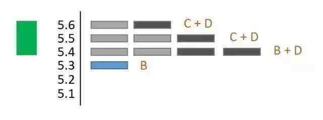 假设1月2日,A获利出场,将手中筹码分批卖给了D,那么当日的筹码分布图将呈现如下变化(深灰色代表新加入的D):