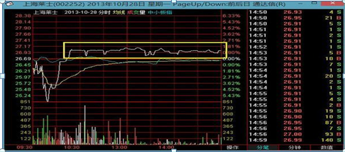 上海莱士在2013年10月28日这一天,从早上10点15分左右开始股价就在27元附近停留,直到收盘,倘若没有主力高控盘的话,恐怕一支股票很难走出这么漂亮的分时这个走势!