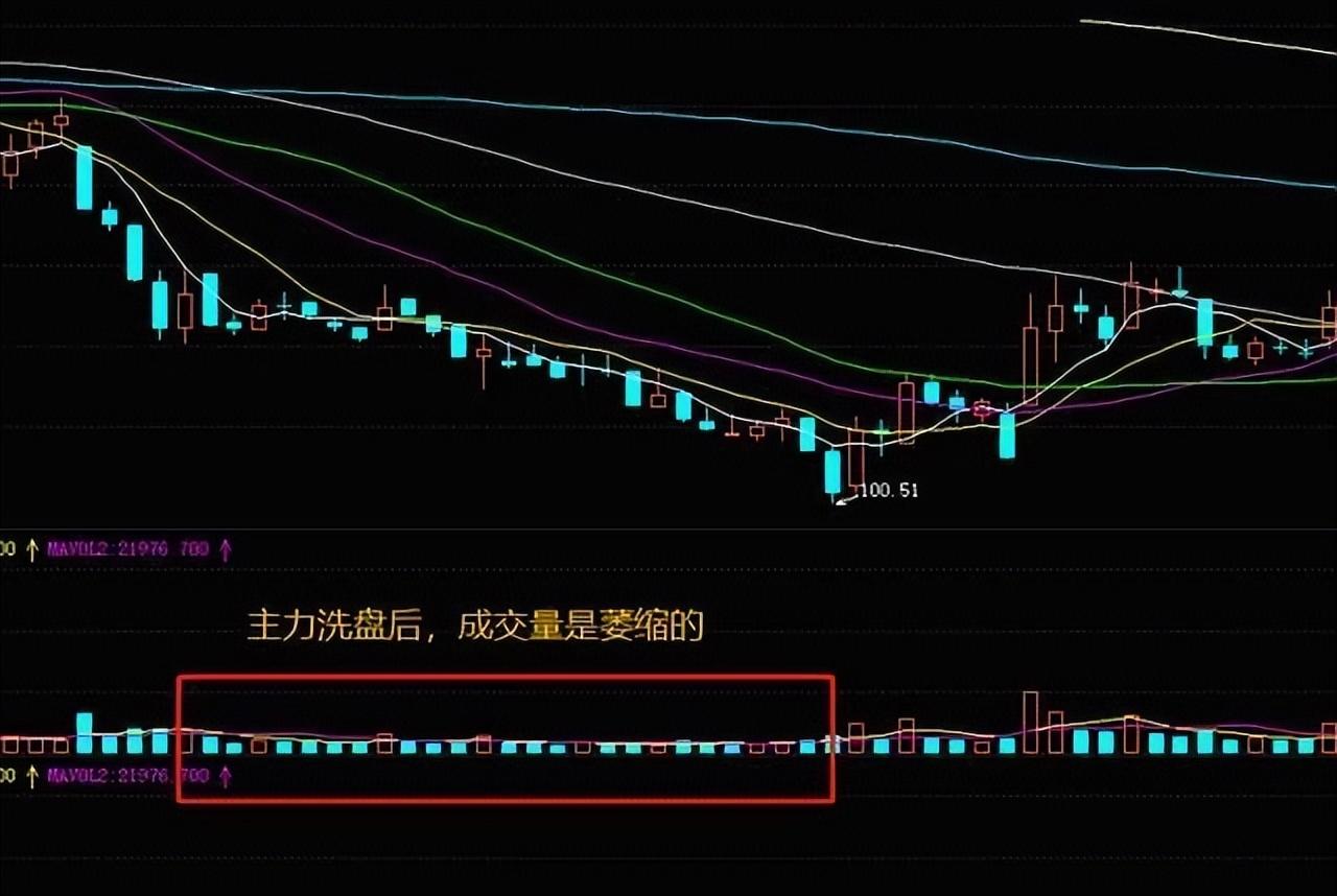庄家洗盘的时候,成交量缩量,随着股价的破位下行,成交量也在不断递减,会经常创造出阶段性地量或者极度萎缩量。