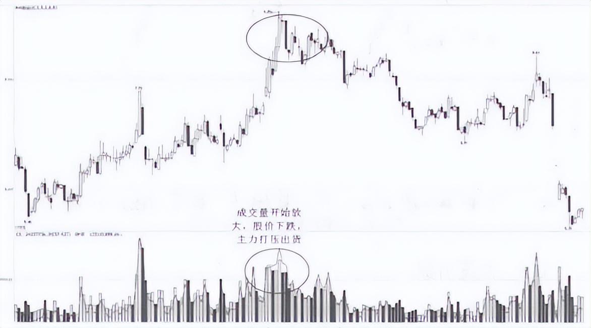 在主力的大量出货下,价格会向下运行,出现被打低的走势,一般会出现相对放量,这就是打压式出货。