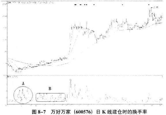 如图8-7所示,万好万家(600576)在以涨停的方式上涨之前,曾经有近七个月的温和上涨阶段。就在这几个月缓慢的拉升当中,主力顺利地完成了建仓的过程。那么怎样才能够提前知晓主力的作为呢?图中的换手率藏着主力的真正动向!股价上涨的初期,在图中A位置处,换手率经常出现高达20%的情况。图中显示股价有三次明显的拉升情况,在拉升过程中,换手率也随之达到了非常高的程度。