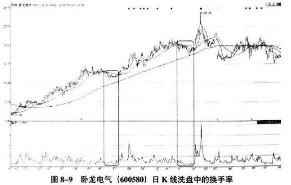 如图8-9所示,卧龙电气(600580)在被主力拉升的过程中,股价也曾经历过打压的过程。对于主力深度介入其中的股票来说,在主力打压洗盘时,一定是散户在大量的出货。既然主力不参与出货,那么换手率一定不会很高。与拉升阶段主力不断拉抬股价不同的是,打压股价的换手率是萎缩的。图中在卧龙电气这只股票的两个洗盘位置中,其换手率都呈现出了萎缩的状态。这正好说明了主力在打压股价时惜售股票,印证了主力在该股中的存在。