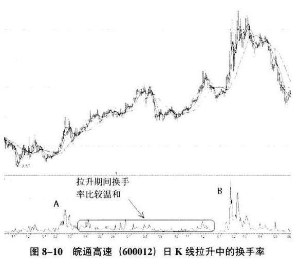 如图8-10所示,皖通高速(600012)虽然算不上是2008年底到2009年底的股市反弹中的大牛股,但是其中却明显看出主力的存在。图中A位置换手率的放大对应着股价的底部,这正是主力建仓所在的价位。而图中B位置恰好是主力拉升出货的位置。为什么这么说呢?因为主力放大换手率建仓和出货的动作简直是太明显不过了。通过分析换手率,主力的行踪就一目了然了。