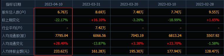 ,公司最新一期股东户数为6.76万,比上期8.68万相比,大幅下降22.17%,人均持股7795股;