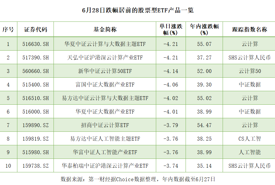受板块波动影响,计算机、通信等相关主题ETF也出现明显下跌。Choice数据显示,6月28日有24只股票型ETF的单日跌幅超过3%,且均被跟踪云计算、大数据、人工智能等相关指数的基金“刷屏”。